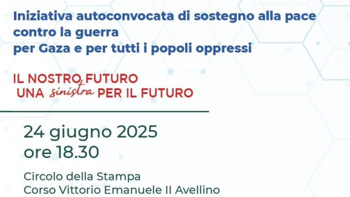Iniziativa autoconvocata di sostegno alla pace contro la guerra, per Gaza e tutti i popoli oppressi. E' in programma ad Avellino al Circolo della Stampa il prossimo 24 giugno alle 18.30. "Il nostro futuro, una sinistra per il futuro".