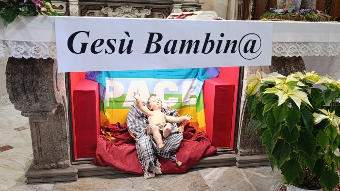 Sarà una bambina a nascere questa nella grotta del presepe allestito da don Vitaliano Della Sala nella chiesa di Capocastello a Mercogliano, in provincia di Avellino. «Gesù Bambin@ - spiega il parroco no global - perché oggi si incarnerebbe nella bambine e nei bambini senza casa, senza terra, senza pace e senza domani della Palestina e di Gaza, dell'Ucraina e del Sud Sudan. È tutti gli ultimi e diseredati della terra. Senza casa, terra, lavoro, alimenti, salute, educazione, libertà, giustizia, indipendenza, democrazia, pace, patria. Senza domani. Gesù è il barbone, il tossicodipendente, l'extracomunitario, il diversamente abile, il malato di mente. Non è mai l'Erode di turno, il potente, il superbo, il ricco». La statuina intende essere anche un richiamo «per indicare, anche ai teologi per i quali solo i maschi possono essere chiamati al presbiterato, la strada che non discrimini più le donne che chiedono di poter essere preti».