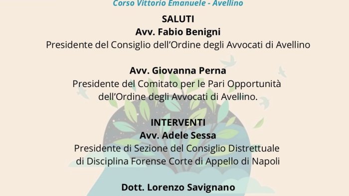 A moderare l'incontro l'avvocato Antonella Sorice, vice presidente del Comitato per le Pari Opportunità dellìOrdine degli Avvocati di Avellino.Ai partecipanti saranno attribuiti 3 crediti formativi in materia deontologica.
