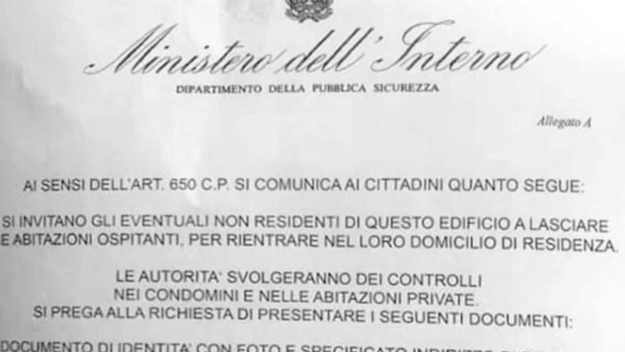 Un testo su una fasulla carta intestata del Ministero dell'Interno affisso all'ingresso di diversi palazzi di Avellino, in cui si annunciano dei fantomatici "controlli" delle "autorità" nei "condomini e nelle abitazioni private", invitando "gli eventuali non residenti di questo edificio a lasciare le abitazioni ospitanti, per rientrare nel loro domicilio di residenza". Neanche a dirlo, le autorità competenti hanno prontamente smentito la veridicità di queste informazioni, confermando che si trattava di un tentativo di truffa.