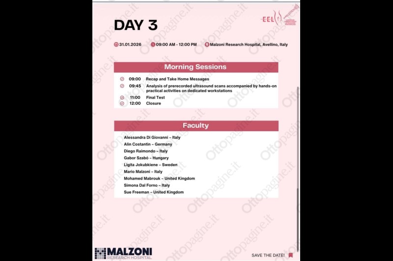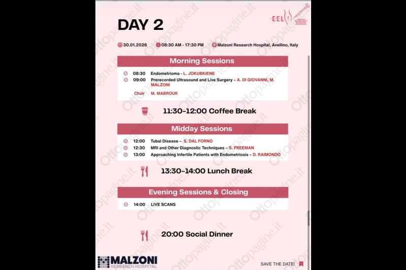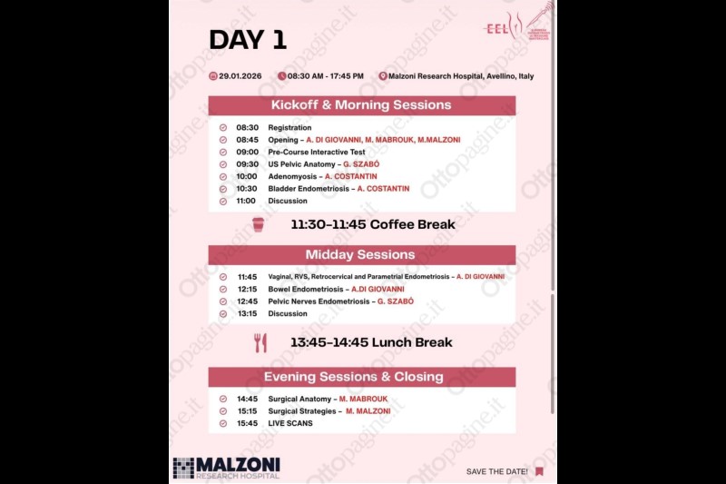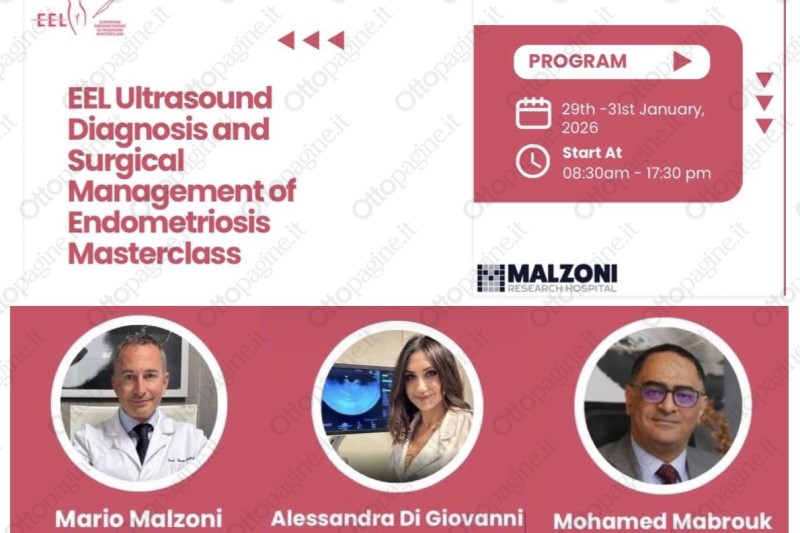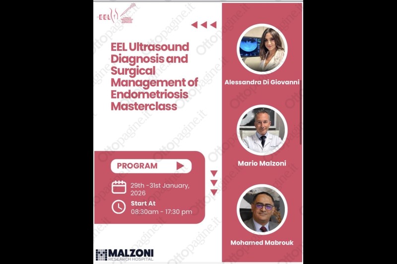 L'evento organizzato dal Malzoni Research Hospital in collaborazione con la Endometriosis European League (EEL) dal titolo “Ultrasound Diagnosis and Surgical Management of Endometriosis Masterclass” vedrà riuniti nel centro di ricerca internazionale i massimi esperti sul tema. La Dott.ssa Alessandra Di Giovanni, il Prof. Mario Malzoni e il Prof. Mohamed Mabrouk (UK) i protagonisti dell'evento mondiale che vedrà riuniti in tre giorni, dal 29 al 31 gennaio 2026, massimi esperti internazionali con lezioni frontali, Ecografie Live, esercitazioni su simulatori ecografici e chirurgie dal vivo. Collegamenti da remoto e sezioni live renderanno per la tre giorni Avellino capitale della medicina a livello mondiale.
