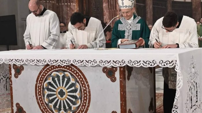 Il 13 febbraio in una Cattedrale affollata all’inverosimile si è svolta l’Ordinazione Diaconale di Andrea, Francesco e Stefano che, come i tre giovani nella fornace ardente, hanno accettato di rispondere “Sì, lo voglio!” ad una chiamata ardua. In tempi di “passioni tristi” e di generale appiattimento, la risposta entusiasta dei tre Ordinandi è risuonata come uno squillo di tromba, una “chiamata alle armi” per intraprendere la lotta spirituale. “Tutto ciò che è grande è nella tempesta” affermava il filosofo Heidegger, commentando Platone, il giorno del suo insediamento come Rettore dell’Università di Friburgo. Il Vescovo prendendo spunto da questa frase ha incitato i nuovi Diaconi a non adattarsi al mondo, a non cercare false paci, irenismi facili, ma ad accettare la sorte di chi, come i gabbiani, non ha nido e segue il suo destino “balenando in burrasca".