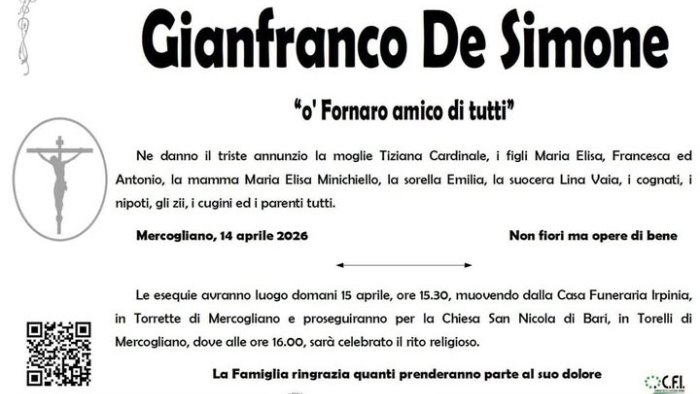Il rito funebre prenderà il via alle ore 15.30 dalla Casa Funeraria Irpinia, in località Torrette, da dove il corteo proseguirà verso la Chiesa di San Nicola di Bari, a Torelli, dove alle ore 16.00 sarà celebrata la funzione religiosa.