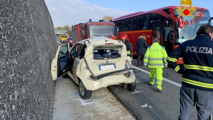 Un autobus di linea proveniente da San Giovanni Rotondo, in viaggio sull'autostrada A16 e diretto a Roma, per cause in corso di accertamento, si è scontrato con una utilitaria che lo precedeva in corsia.