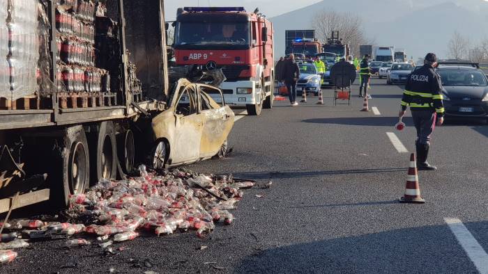 E' di un morto carbonizzato il bilancio del tragico incidente avvenuto in autostrada questa mattina prima delle 8 nel territorio di Tufino, subito dopo Baiano. L'impatto, violentissimo, è avvenuto tra una Pegeout e un autocarro adibito al trasporto di bevande. Sul posto tempestivo l'arrivo dei vigili del fuoco e degli agenti della Polstrada Avellino Ovest, guidati dal comandante Renato Alfano. L'arrivo dei soccorsi e dei sanitari del 118 non ha potuto salvare la vita alla persona alla guida della automobile, rimasta gravemente ferita e morta carbonizzata nel rogo che si è scatenato nel veicolo a seguito dell'impatto con il grosso automezzo. I vigili del fuoco hanno sedato le fiamme e provveduto a consegnare il ferito ai sanitari. Tutto inutile. I medici e infermieri del servizio di soccorso altro non hanno potuto che constatare il decesso dell'automobilista. Da accertare l'identità della persona tragicamente morta nell'incidente. Dalla vettura, ridotta ad un groviglio fumante di lamiere, è stato estratto un cadavere, probabilmente di un giovane. Semplici ipotesi visto lo stato del corpo, devastato dalle fiamme, e l'impossibilità di reperire dati dai documenti andati distrutti dal rogo. La vettura risulta intestata ad un 25enne di origini napoletane. Intanto si registrano lunghe code in direzione Napoli. Gli agenti della Polstrada hanno messo in sicurezza l'area per consentire con particolare cautela il decorso del traffico in A16. Come si evince dalla foto del sinistro i soccorsi sono stati particolarmente difficili e articolati per polstrada e caschi rossi. Sulla Napoli-Canosa tratto chiuso e 2 km di coda tra Tufino e Baiano, all'altezza del bivio con la A30 in direzione di Napoli.