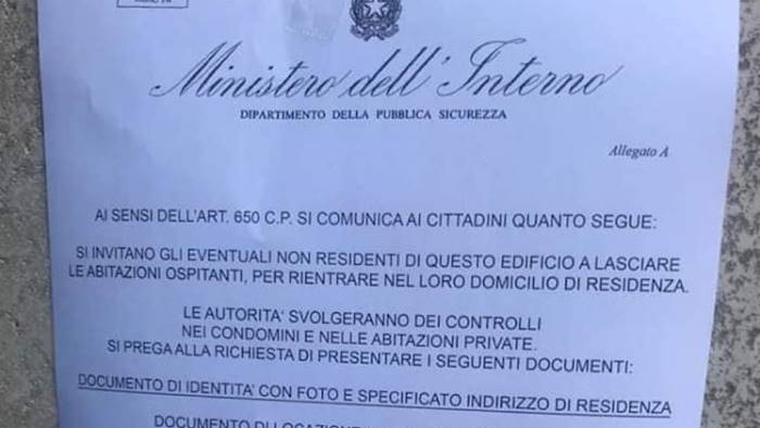 Anche ad Avellino come a Napoli sono stati affissi sui muri di alcuni palazzi del centro volantini con la falsa intastazoine del Ministero dell'Interno e nel quale si preannunciano controlli in occasione del Covid-19.