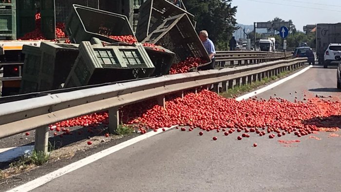 Pomeriggio di paura e disagi nei pressi del casello autostradale di Avellino est lungo la strada statale 7 bis. Un tir carico di pomodori ha rovesciato gran parte del suo carico lungo la carreggiata, e sul guard rail nella direzione opposta. E' successo nel territorio del comune di Atripalda.
