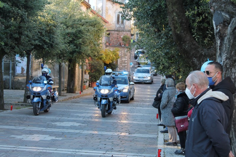 Un silenzio surreale rotto dallo scroscio di un lungo e commovente applauso, poi il volo dei palloncini bianchi in cielo per dare l'ultimo saluto a Giuseppe Manfra, l'agente della Polstrada di 41 anni stroncato dal Covid. Oggi ci sono stati a Candida i funerali del giovane agente morto di coronavirus al Moscati di Avellino, dopo 45 giorni di cure. I rintocchi della campana nella chiesa madre, in paese, hanno scandito l'arrivo del feretro, scortato da una volante della polstrada. Una di quelle volanti su cui Giuseppe da anni prestava servizio. All'uscita della bara, avvolta nella bandiera tricolore italiana, c'è stato il lancio di palloncini bianchi in cielo, tra fila di agenti di polizia schierati in uniforme per salutare il collega stroncato dal coronavirus.