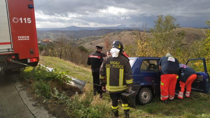 L'auto dopo aver sfondato il guard rail resta quasi in bilico in una cunetta