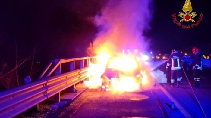 Auto in fiamme sull'A16, paura per tre persone e un cane