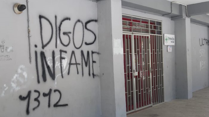 Scritte indecifrabili invece in periferia tra la sede sede dell'ufficio postale, l'associazione Panacea e il dipartimento di salute mentale. Una in particolare è rivolta alle forze dell'ordine: "Digos infame". Sull'accaduto indaga la polizia.