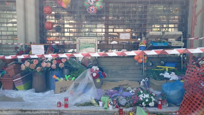 Lumini e fiori, anche sulla sua bicicletta ancora parcheggiata davanti al negozio.