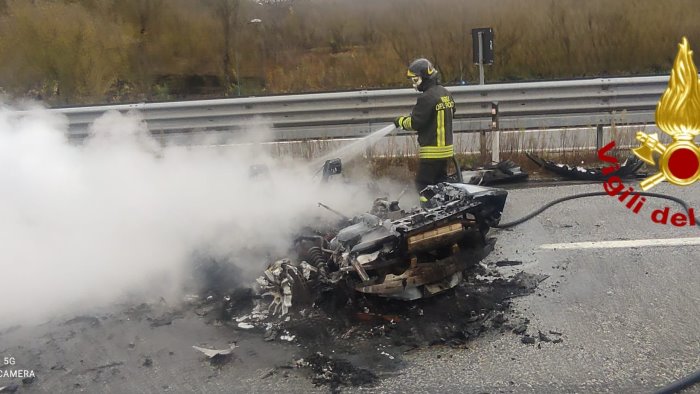 I Vigili del Fuoco di Avellino nel pomeriggio di oggi sono intervenuti sull'autostrada A 16 Napoli-Canosa, al Km. 46 in direzione Canosa, nel territorio del comune di Avellino, per un incidente stradale che ha visto coinvolta un autovettura, la quale prima finiva contro il guard rail e poi prendeva fuoco. Le fiamme che hanno avvolto il veicolo sono state spente mettendo in sicurezza l'area. I due uomini a bordo non hanno subito grosse conseguenze tanto da essere visitati sul posto dai sanitari del 118 interventi, senza fare ricorso al ricovero ospedaliero. La corsia è rimasta chiusa al traffico durante le operazioni di spegnimento e fino al ripristino della carreggiata.