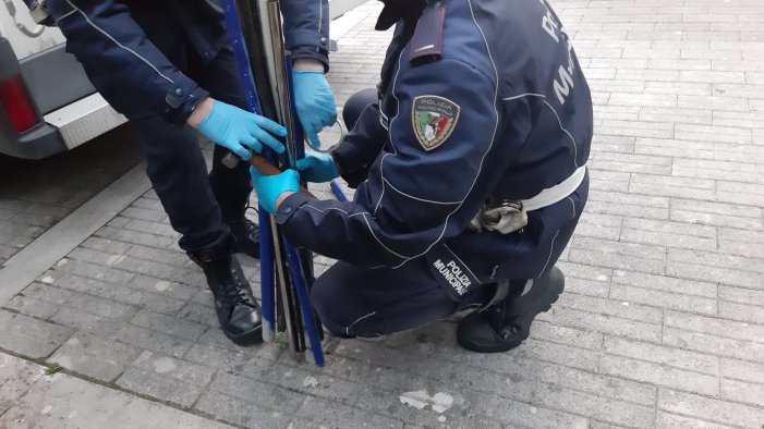 Mazze, tubi e persino un grosso martello. E' quanto hanno rinvenuto e portato via gli uomini della polizia municipale da un'aiuola situata vicino all'ufficio postale e al centro di igiene mentale dell'Asl.