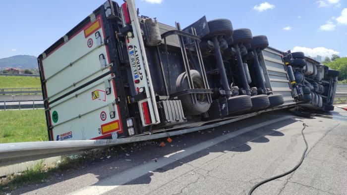 Un automezzo pesante che trasportava carne per cause in corso di accertamento si è ribaltato allo svincolo di Grottaminarda in direzione Napoli.