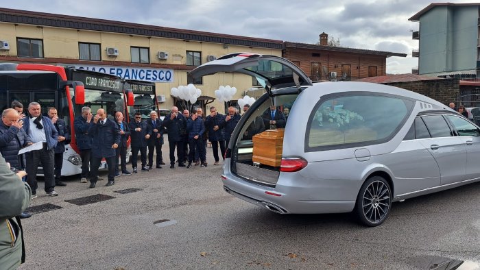 Momento di grande commozione al deposito Air, dove Francesco Estatico lavorava. Oggi nel giorno dell'ultimo saluto, i suoi colleghi lo hanno voluto omaggiare così: fiori, palloncini e pullman dell'Air con la scritta ciao Francresco. Poi il feretro ha proseguito il suo viaggio verso la chiesa di Avella, dove si sono celebrati i funerali del 35enne, morto al "Fatebenefratelli" di Benevento dopo tre interventi di bypass gastrico.