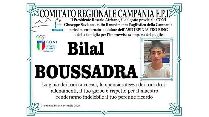 "Non è necessario, in questo contesto, ripercorrere le tappe dei numerosi ed importanti successi ottenuti, tanto da essere attenzionato dallo staff delle federazione pugilistica nazionale. La Federazione pugilistica campana ed il Coni di Avellino sono vicini alle famiglie ed al tecnico di Bilal, Sandro Frongillo."