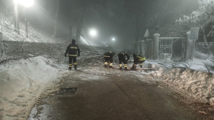 Cade un albero e trancia i fili della pubblica illuminazione. E' successo a Trevico, in Irpinia, nel comune più alto della Campania, in prossimità della villa comunale in via Nicola Petrilli dove la coltre bianca ha raggiunto circa 40 centimetri in paese.