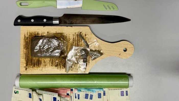 Durante la successiva perquisizione presso l’abitazione dell’uomo, sono stati rinvenuti nr. 2 taglieri e nr. 2 coltelli impregnati di sostanza stupefacente nonché 69 bustine trasparenti vuote con chiusura adesiva ed un rotolo di cellophane trasparente; strumenti e materiale per il verosimile confezionamento in dosi delle sostanze stupefacenti. Il tutto è stato debitamente sottoposto a sequestro.