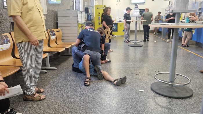 Ha lanciato i tavoli in aria, ha inveito contro i dipendenti dell'ufficio postale. Immediatamente è stata allertata la questura. Sul posto sono giunte due pattuglie della squadra Volanti. L'uomo all'arrivo degli agenti ha continuato nella sua condotta, sferrando un pugno al poliziotto intervenuto.