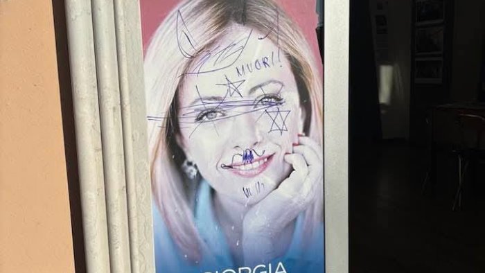 Ignoti hanno imbrattato con scritte e simboli un manifesto elettorale raffigurante il volto del presidente del consiglio Giorgia Meloni, davanti alla sede di Fratelli d'Italia lungo la centralissima via D'Afflitto a pochi passi da piazza plebiscito.