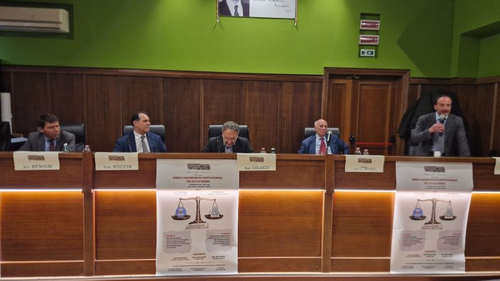 Riforma costituzionale: nell'Aula Magna del tribunale di Avellino, a confronto contemporaneamente le ragioni del "SI" e del "NO". Per le ragioni del “SI” sono intervenuti il dottor Giacomo Rocchi, presidente della prima sezione penale della Corte di Cassazione; il professor avvocato Giulio Prosperetti, vicepresidente emerito della Corte costituzionale; l’avvocato Francesco Perone, del Foro di Avellino. A sostenere le ragioni del “NO” sono stati il professor avvocato Bruno Spagna Musso, già magistrato della Corte di Cassazione; il dottor Marcello De Chiara, consigliere della Corte d’Appello di Napoli; il professor avvocato Giorgio Fontana, del Foro di Avellino.