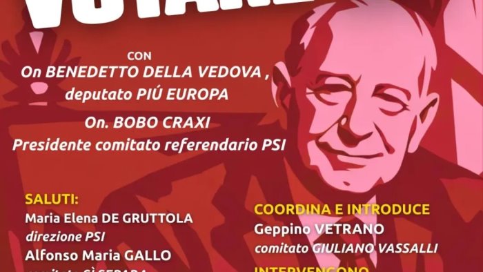 Si susseguono gli eventi della campagna referendaria in città e provincia. Giovedì 26 febbraio arrivano nella città capoluogo il parlamentare di Più Europa Benedetto Della Vedova e il presidente del Comitato Referendario “Comitato Giuliano Vassalli per il Sì”, Bobo Craxi. L’iniziativa è prevista per le 17 al Circolo della Stampa. A moderare l’incontro sarà Giuseppe Vetrano, che guida in Irpinia il Comitato intitolato al padre della riforma del Codice Penale "Perchè votare Sì".