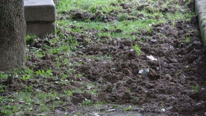 Dopo aver scavato in più punti il grande prato all'ingresso della nascente nuova piazza Lusi, l'animale selvatico, spesso aiutato da un altro esemplare ha devastato anche gli spazi verdi che costeggiano il castello normanno. Una devastazione ovunque, nel disinteresse e menefreghismo più totale.