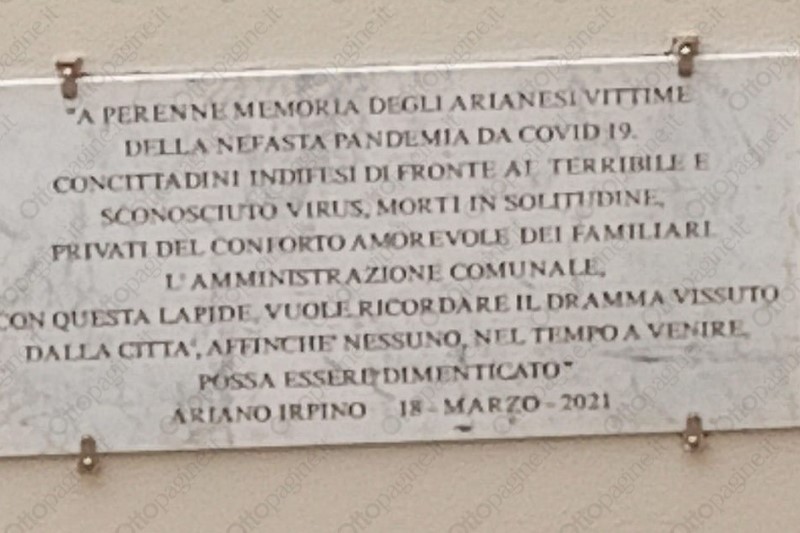 "A perenne memoria degli arianesi vittime della nefasta pandemia da Covid-19. Concittadini indifesi di fronte al terribile e sconosciuto virus, morti in solitudine, privati del conforto amorevole dei familiari. L'amministrazione comunale, con questa lapide, vuole ricordare il dramma vissuto dalla città, affinchè nessuno, nel tempo a venire, possa essere dimenticato."