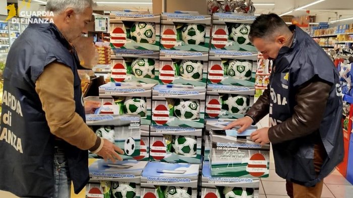 Le Fiamme Gialle del Comando Provinciale di Avellino, nel corso di un servizio predisposto per il contrasto alla contraffazione, hanno sequestrato diverse confezioni di uova di cioccolato a cui era abbinato un pallone da calcio riportante il logo ufficiale della locale squadra di calcio, regolarmente depositato all’Ufficio Italiano Brevetti e Marchi dall’associazione che ne detiene la proprietà, palesemente alterato/contraffatto.