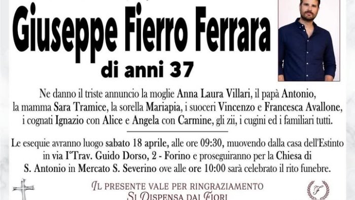 Tre comunità unite nel dolore per la prematura scomparsa di Giuseppe Fierro Ferrara. Forino, Montoro e Mercato San Severino piangono la perdita di Giuseppe Fierro Ferrara, venuto a mancare a soli 37 anni dopo aver affrontato con coraggio un male incurabile che lo ha strappato troppo presto alla vita, ai suoi affetti e alle sue passioni.