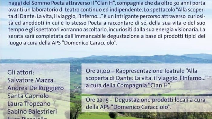 In scena, alle ore 21,00, “Alla scoperta di Dante: La vita, il viaggio, l'Inferno...”, un intrigante percorso attraverso curiosità ed aneddoti in cui è lo stesso Poeta a raccontare di sé, della sua vita e del suo tempo e gli spettatori vorranno ascoltarlo, incuriositi dalla sua energia visionaria. La narrazione dell’Inferno ed accenni alle opere, allontaneranno dalle stereotipate forme dell’interpretazione, dalle deformità fisiche e morali dei personaggi che popolano il mondo dantesco, indagando, a volte anche con ironia, le loro deformità psicologiche, le devianze, le pulsioni morali e politiche.