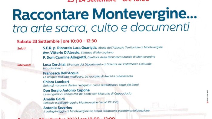 "Raccontare Montevergine tra arte sacra, culto e documenti”: è il titolo dell'iniativa in programma sabato 23 e domenica 24 settembre nel Salone degli Arazzi del Palazzo Abbaziale del Loreto nell'ambito delle Giornate Europee del Patrimonio 2023. Previsti autorevoli interventi nella due giorni. I saluti saranno affidati a Riccardo Luca Guariglia, Abate di Montevergine, padre Domenico Allegretti, direttore della Biblioteca Statale di Montevergine e Vittorio D'Alessio, sindaco di Mercogliano.