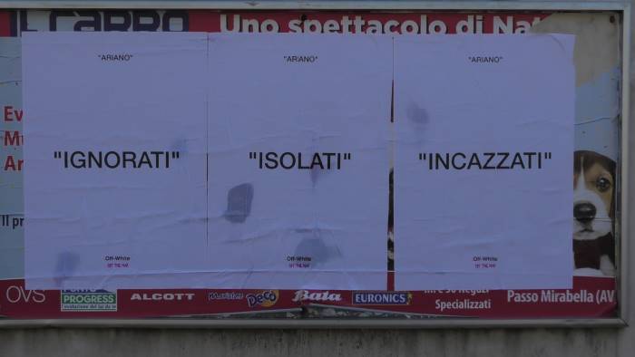 Ariano: "Ignorati, isolati, incazzati. Off wite, off the map." E' il contenuto dal mittente imprecisato, probabilmente a sfondo politico, dei tre manifesti affissi sulle cantonate della città, mura di abitazioni, portoni, serrande e pensiline a firma anonima. Tutti nelle vicinanze della villa comunale.