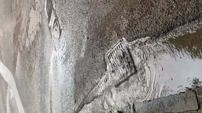 L'acqua fuoriesce dall'asfalto e dai tombini. Le grate sono quasi tutte otturate sia in questa zona che in altri punti della città a causa della mancata manutenzione. E' uno dei tratti rimasti ancora privi dell'asfalto insieme a via Giacomo Matteotti interessata da lavori di scavo.