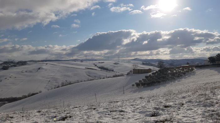 Da stamane il sole ha reso ancora più incantevole il panorama. Bellissime le immagini della verde vallata imbiancata soprattutto a Camporeale. E chissà che la spolverata di ieri possa essere stata solo un piccolo accenno in attesa di una vera nevicata come negli anni 80-90.