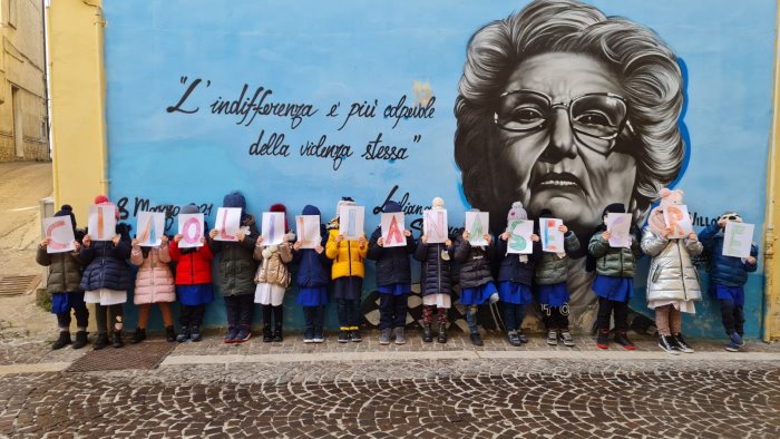 In occasione della giornata della memoria, i piccoli alunni delle classi I A e B della scuola primaria, plesso Calvario, istituto don Lorenzo Milani di Ariano Irpino, insieme ai loro insegnanti, si sono recati ad omaggiare il murale dedicato a Liliana Segre, che lo scorso anno era stato tra l'altro deturpato con la scritta "Dux" e poi ripulito grazie all' intervento del sindaco Enrico Franza e dell'amministrazione comunale.