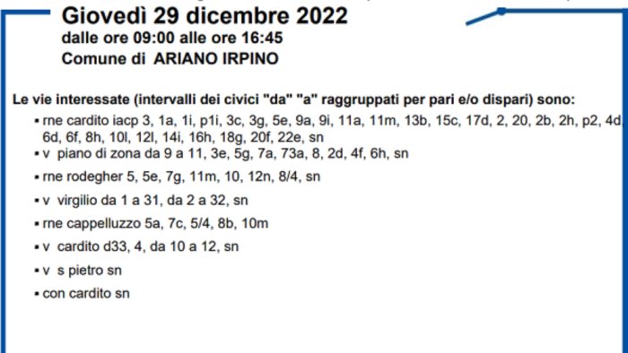 Il comune di Ariano Irpino ha ricevuto un avviso di interruzione di energia elettrica per domani giovedì 29 dicembre 2022 dalle ore 9,00 alle ore 16,45, da parte di e-distribuzione per effettuare lavori sugli impianti.