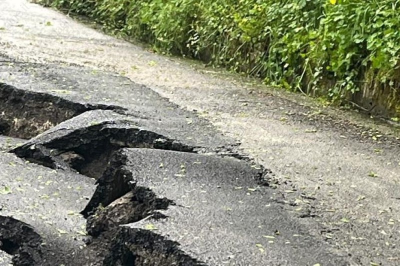 Come per Costa Anitra: posa di un manto di asfalto su un fondo stradale con frana in atto.
