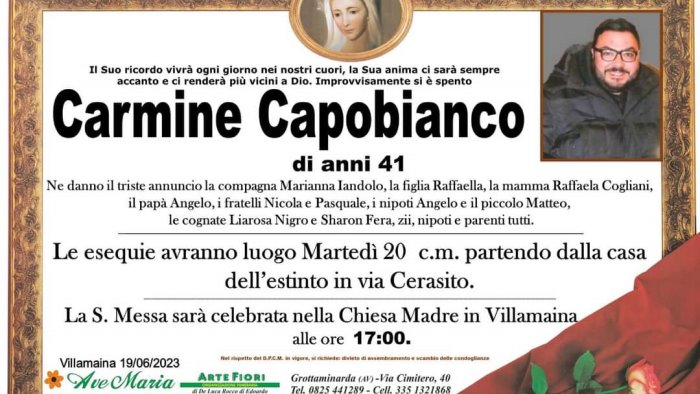 È un giorno di lutto nel comune di Villamaina, piccolo paese in provincia di Avellino, per la morte di Carmine Capobianco 41enne morto improvvisamente ieri, in seguito ad un malore, che non gli ha lasciato scampo. Era in moto Carmine quando si è sentito male. È finito fuori strada, impattando contro un albero. Oggi i funerali del giovane padre e marito. Le esequie si terranno alle 17 nella chiesa madre del paese. Il sindaco di Villamaina, Nicola Trunfio, ha proclamato il lutto cittadino per la giornata di oggi. La comunità piange un giovane uomo, strappato alla vita troppo presto. “Il suo ricordo vivrà sempre nei nostri cuori, con la sua morte si è spenta la parte migliore di me” spiega il fratello Pasquale, che racconta lo strazio infinito di tutta la famiglia. Anche il comune di Gesualdo partecipa del dolore della famiglia Capobianco e della comunità di Villamaina.