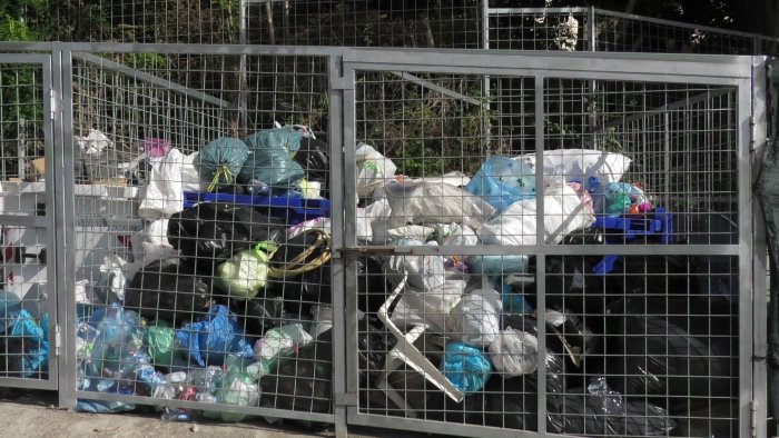 Area di conferimento dei rifiuti differenziati intasata, impossibile aprire il cancello. Abitanti costretti a lanciare sacchetti dalla recinzione esterna.