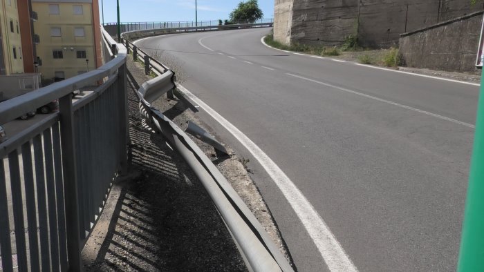 Un guard rail schiacciato da un'auto o molto probabilmente nei mesi scorsi da un mezzo pesante o spargisale e un marciapiede letteralmente bloccato.