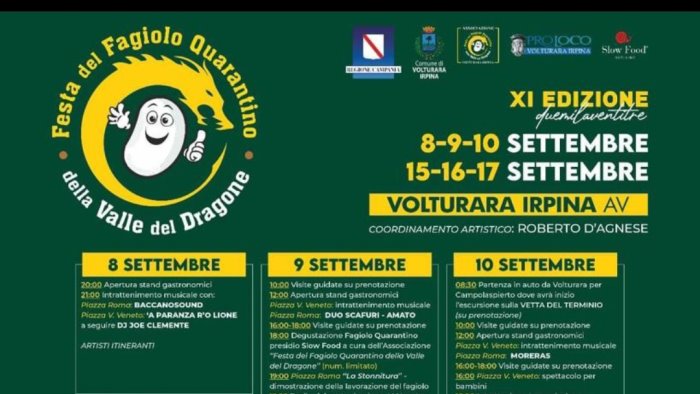 Si parte venerdì otto settembre alle 20 con l'attesa apertura degli stand enogastronomici, musica ed eventi con Baccanosound, “'A Paranza Ro Lione” e dj joe. Sabato 9 settembre ancora gusto ma dalle ore 10 via alle visite guidate su prenotazione alla Bocca del Dragone, la Piana Del Dragone, la Chiesa Madre, nel museo Etnografico tra vicoli e centro storico. Già dalla mattina eventi e musica con il Duo Scafuti Amato e la sera gran concerto con la Nuova Compagnia di Canto Popolare e “;a Paranza Ro Tramuntan” e per finire Dj Rob del Percio e Raf Colucci.- Domenica ancora visite guidate con tappa anche sulla vetta del Terminio e poi sono tanti gli eventi e concerti fino a sera. Quando ci saranno i Ronde Urbane, i Cantautorando e i Forlai Dj Set-. Ma la festa del Fagiolo Quarantino è lunga e si torna ad animare ogni angolo di Volturara per il week end dal 15 al 17 settembre con un altro ricco cartellone di eventi. Per info Emilia 3409700282. Per escursioni e arrampicata: Federico 3293710614. Per le visite al Museo: Mario 3291895094. Visite Piana del Dragone Giovanni 3400828760. Info Per gruppi Pullman 3409700282 oppure 3299696089. Area Camper: 0825984024 - 3409700282