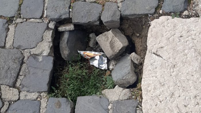 Sampietrini inesistenti dopo essere saltati e buca ad alto rischio. Accade a Piano della Croce, lungo il marciapiede che dal monumento ai caduti porta a parco Pallottini.