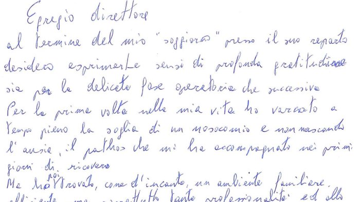 Il primo encomio del 2024 per l'Ospedale Moscati di Avellino arriva da un paziente in dimissione che, prima di lasciare la Città ospedaliera, ha voluto salutare e ringraziare con una bellissima lettera il dottor Brenno Fiorani, direttore dell’Unità operativa complessa di Cardiochirurgia, e tutto il suo staff per la professionalità e la sensibilità mostrate durante il suo ricovero. “Mi sono sentito ospite di gente unica" ha scritto il paziente, in una emozionante missiva pubblicata sulla pagina social dell'azienda ospedaliera San Giuseppe Moscati.