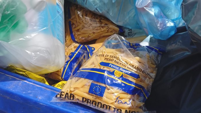 Pasta, fette biscottate ed altri prodotti del banco alimentare all'interno di un cassonetto della raccolta differenziata. Accade ad Ariano Irpino, nella struttura recintata adibita al conferimento dei rifiuti situata nel piazzale del cimitero.