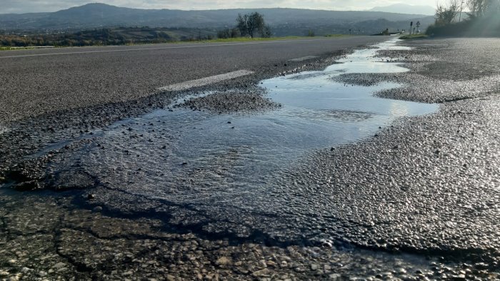 Sgorga acqua limpida da oltre una decina di giorni e forse anche più lungo la statale 90 delle puglie ad Ariano Irpino. Siamo in località Scarnecchia poco distanti dall'antico carpino della Pila sempre più depredato di pietre. Ma questa è storia a parte. All'altezza del grande piazzale adibito al ricovero dei mezzi della società Irpiniambiente vi è una perdita d'acqua ben visibile e ampiamente segnalata all'alto calore ma nulla è stato fatto finora per riparare la condotta idrica.