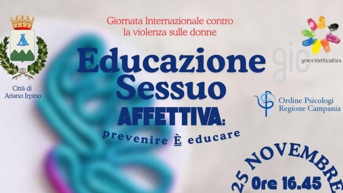 In occasione della "Giornata internazionale per l'eliminazione della violenza sulle donne" il comune di Ariano Irpino, con il patrocinio dell'ordine degli psicologi della regione Campania, e in collaborazione con la fondazione identità cultura Ets, promuove l’incontro: "Educazione sessuo-affettiva: prevenire è educare".