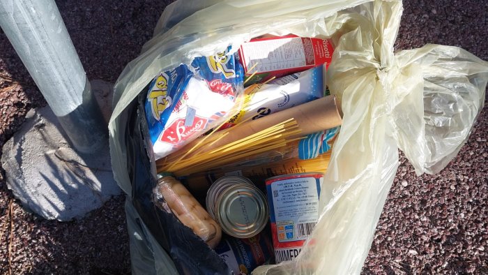 Pasta, salsa, macedonia, risotti, legumi e quant'altro. Tutto in una busta. Prelevato dalla Caritas o associazioni e buttato direttamente nel bidone. E' successo nel piano di zona a poca distanza dal Santuario Madonna di Fatima. A fare la scoperta è stata una residente.