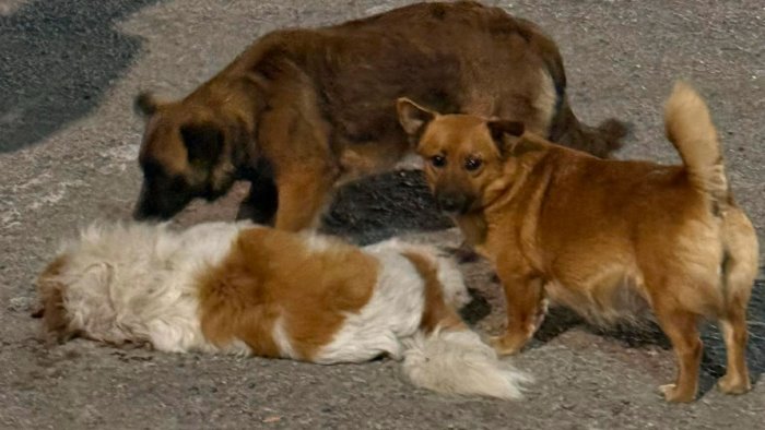 Un cane a terra senza vita, in una pozza di sangue e altri due accanto a vegliarlo e a chiedere aiuto. E' la scena a cui hanno assistito impotenti alcuni giovani i quali hanno tentato invano di sollecitare un intervento, almeno per la rimozione della carcassa e la messa in sicurezza degli altri due.